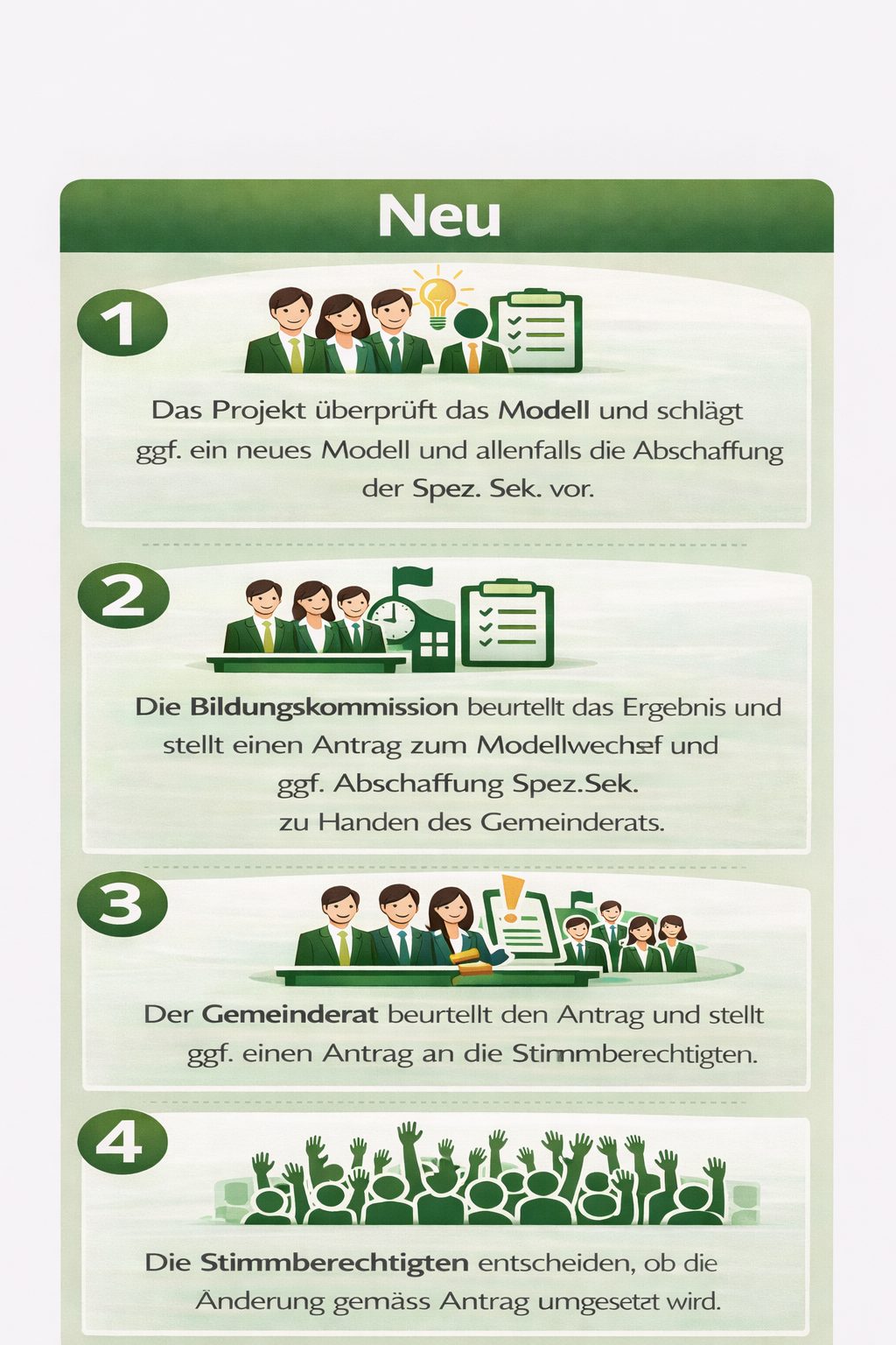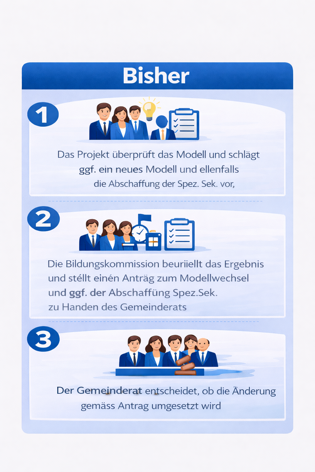Heute bereitet die Bildungskommission die Entscheidung zur Modellwahl vor und stellt einen Antrag an den Gemeinderat. Dieser entscheidet dann über den Modellwechsel und allenfalls die Abschaffung der Spez.Sek.
